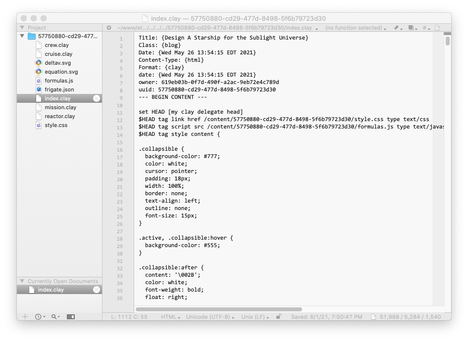 What I'm most excited about is porting all of the encyclopedia and world building tools I've developed for the Sublight universe into something I can parse as a website of an eBook. I have a half-assed index and database I build with Microsoft Excel and Graphviz. But the results, because I can only really edit the data in Excel, can look a little wonky. I am working on moving the writeup for each topic to a clay file, and then indexing them ex-post-facto. In that way I can world build bottom up style, like Wikipedia.
